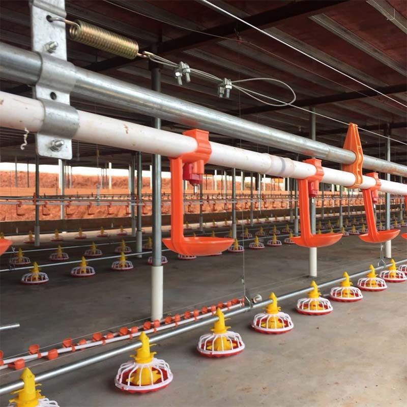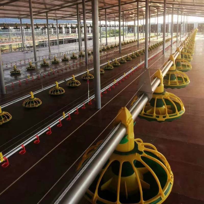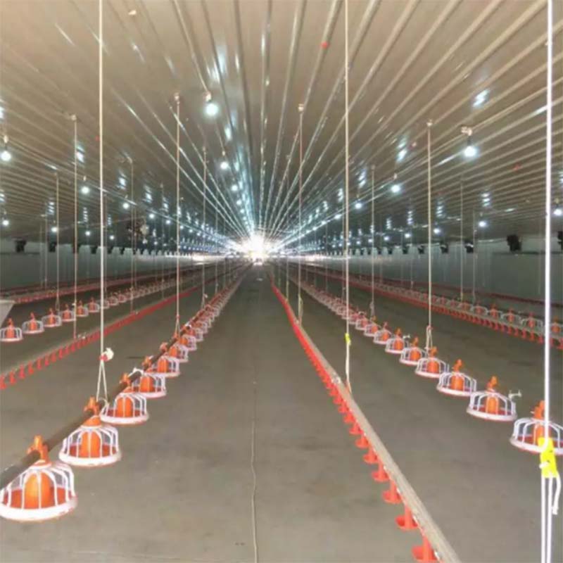 In broiler farming, automatic feeding and watering lines optimize poultry production. These systems ensure a consistent supply of feed and water to broilers, promoting healthy growth and reducing labor costs. They also enable precise control of diet and hydration, improving overall flock performance and efficiency in broiler farms.